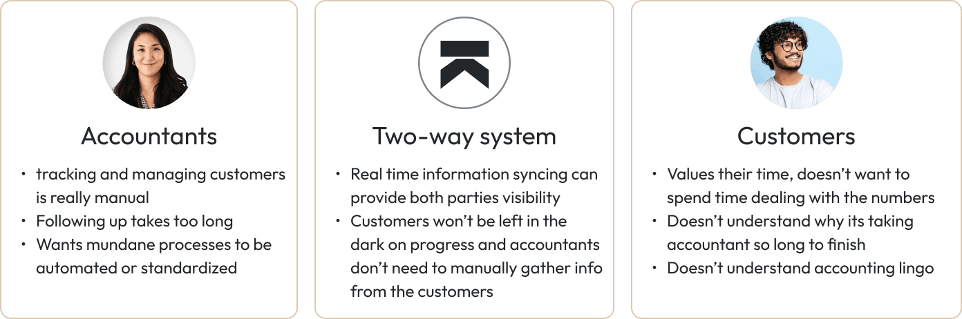 From market research and accountant interviews, the most time consuming part of accounting wasn't actually the accounting itself, but rather, it was the extensive communication needed to get there. This problem was exacerbated when onboarding new customers because of the sheer volume of information needed upfront.