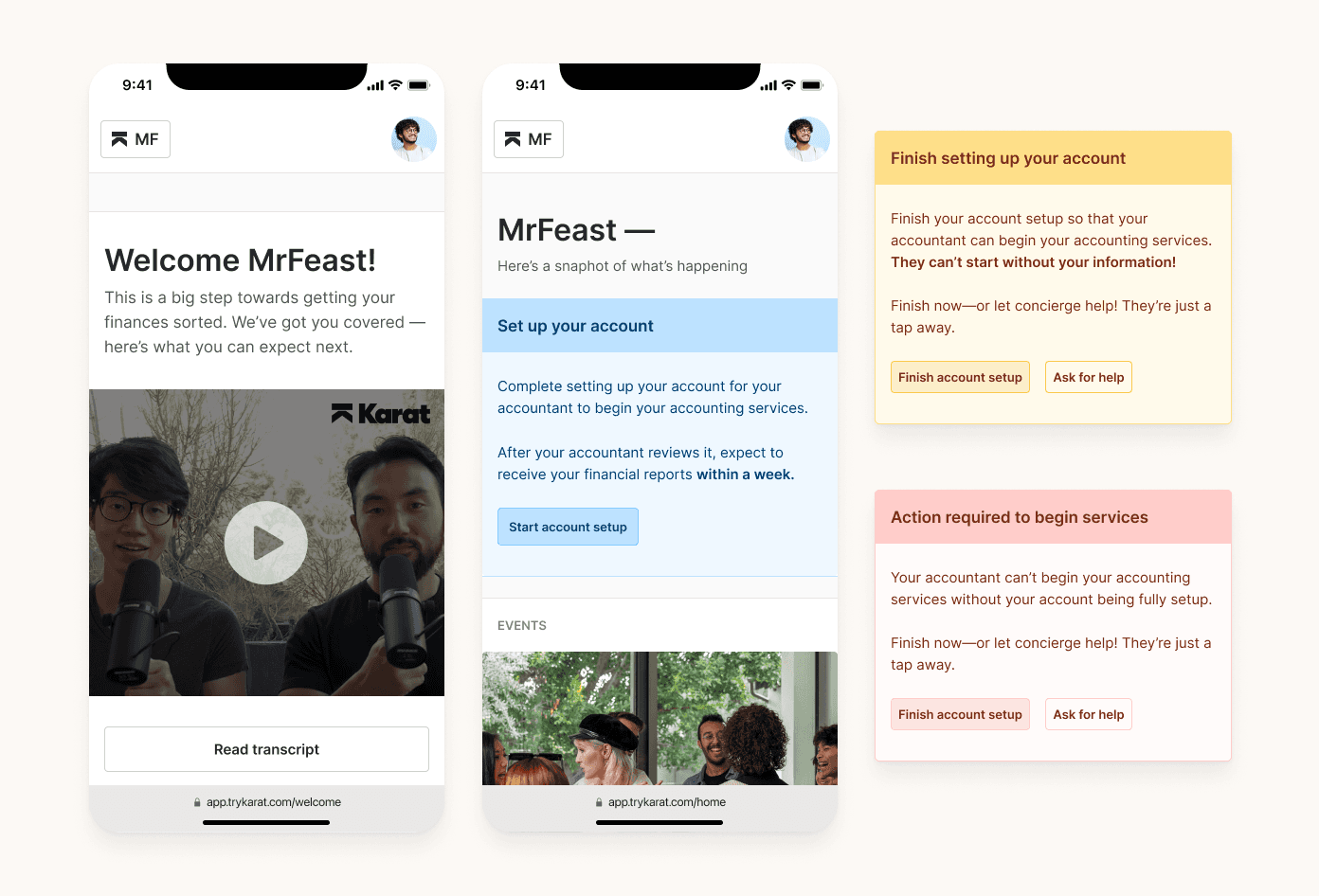 A welcome video from our co-founders added a personal touch to help emphasize the importance of o. For those who didn't complete their account setup, we automated reminders via app, email and text to capture their attention. This reduced accountants’ time having to follow up each time.