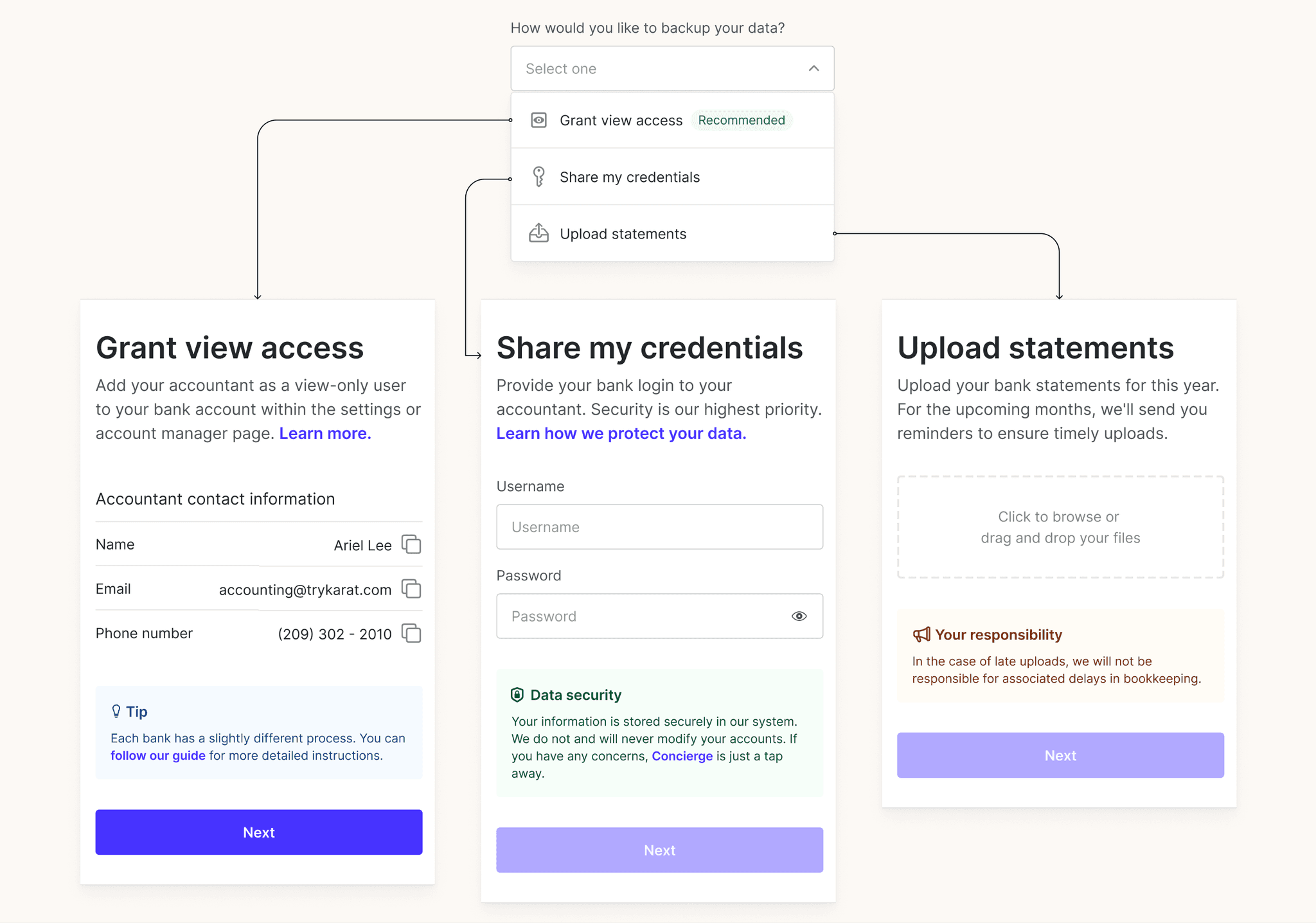 Customers could choose how to backup their financial data. We preferred view access and used a green badge to encourage that selection. On the flip side, uploading statement was the least preferred since it was the most manual method. We discouraged this option by using a yellow warning message to highlight potential delays.